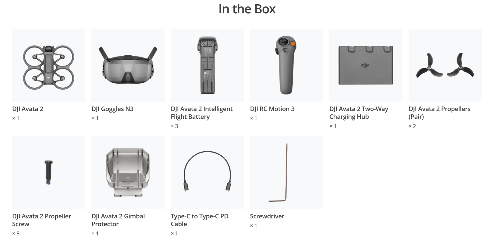 Includes Goggles N3, RC Motion 3, three Intelligent Flight Batteries, Two-Way Charging Hub, and more.