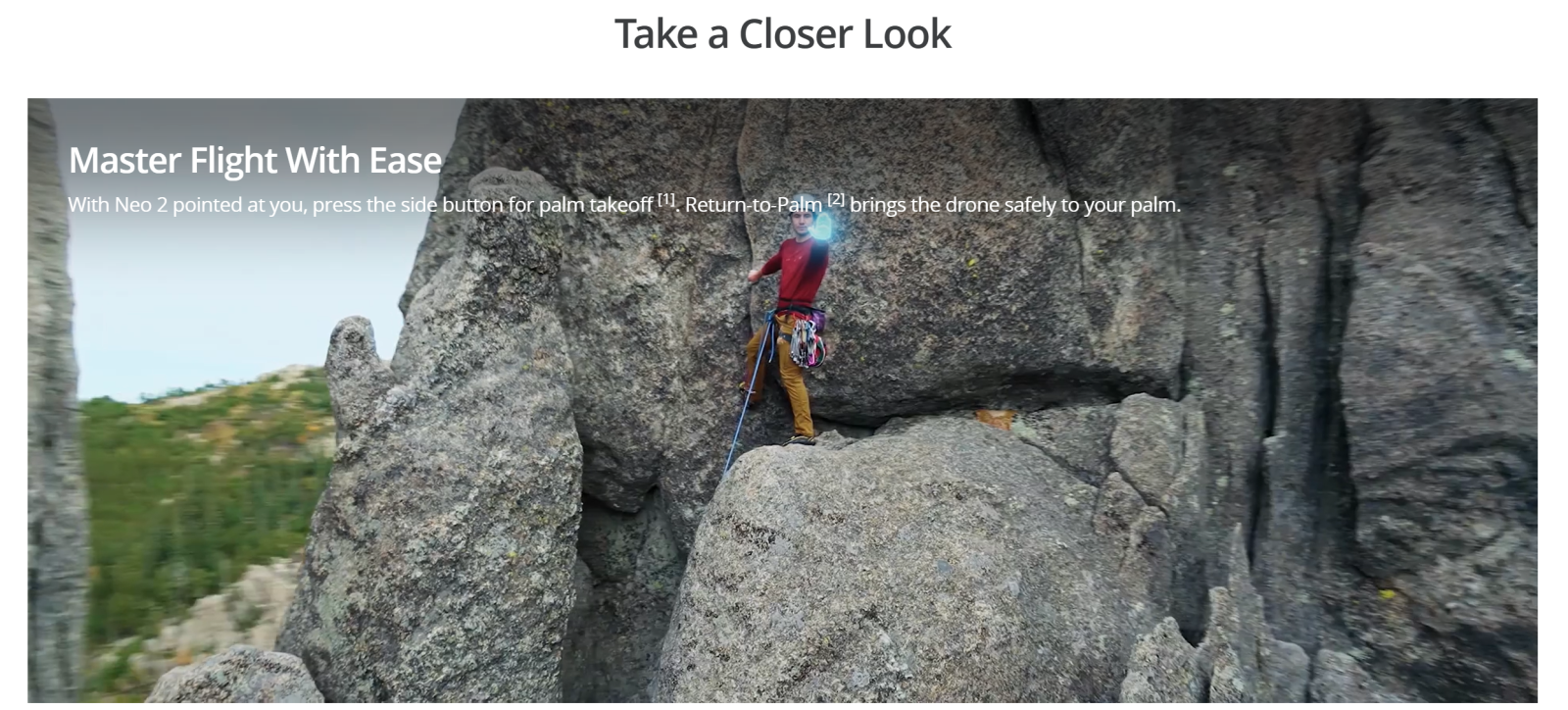 DJI Neo 2 can take off and land from and onto your palm and perform intelligent filming by locking onto the subject using visual algorithms*, all without the need for a remote controller or any auxiliary device.