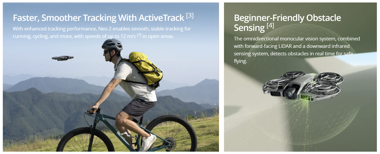 1. Newly added omnidirectional monocular vision system and forward-facing LiDAR: With the new omnidirectional obstacle sensing feature [1], Neo 2 can detect and avoid obstacles when tracking from the front or sides, so even beginners can operate the drone with ease, stability, and confidence. Neo 2 supports versatile flight [2], with enhanced hovering and positioning capabilities over Neo, making it easier to navigate challenging environments like indoors, near buildings, over water, or on snow.