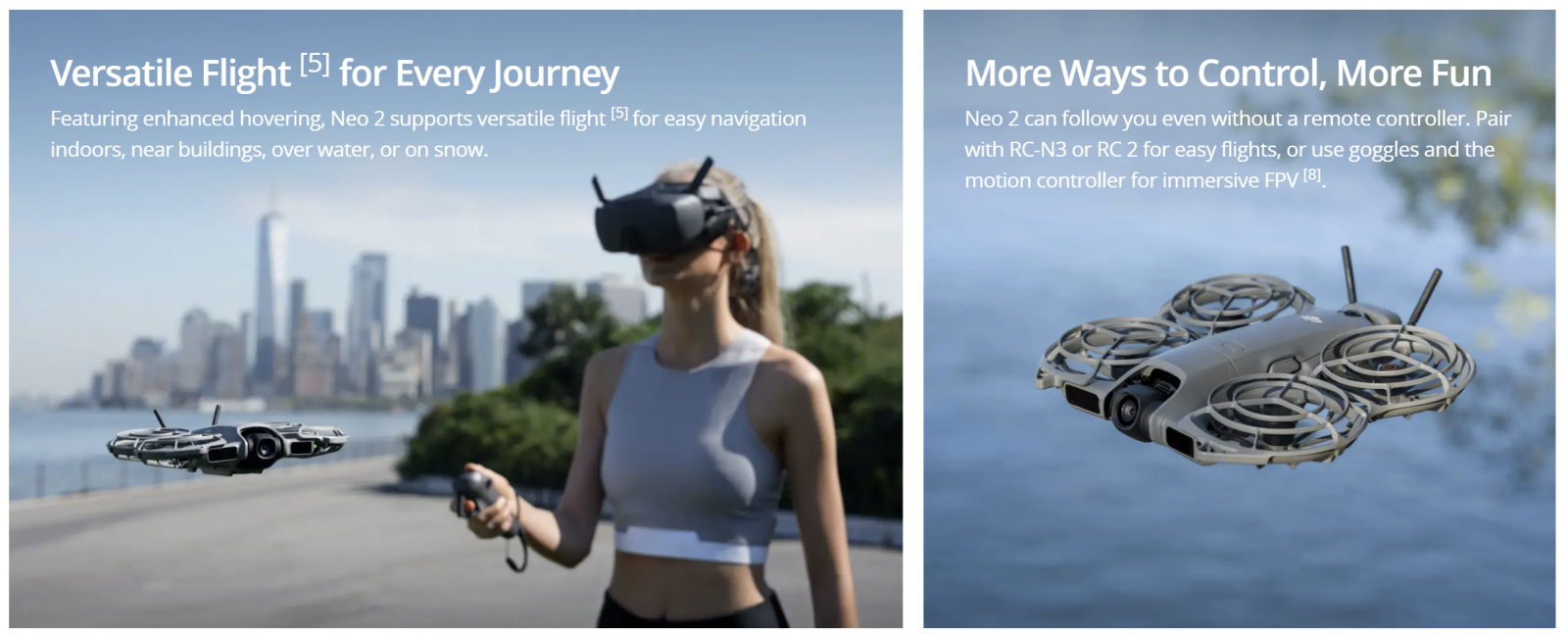 2. Versatile flight refers to DJI Neo 2’s ability to fly both indoors and outdoors, with greatly enhanced performance compared to DJI Neo, especially in conditions like flying over water or snow. Always ensure compliance with local laws and regulations, certification requirements, and airspace authorizations, and make sure you understand and have obtained all necessary permissions before operating the drone. Flight performance may decrease if the drone is flown near solid-colored, transparent, or low-texture surfaces under weak GNSS signal conditions. Always fly with caution in well-lit environments. When flying over water, maintain an altitude of at least 1 m to ensure safety. Refer to the product’s user manual for more details.