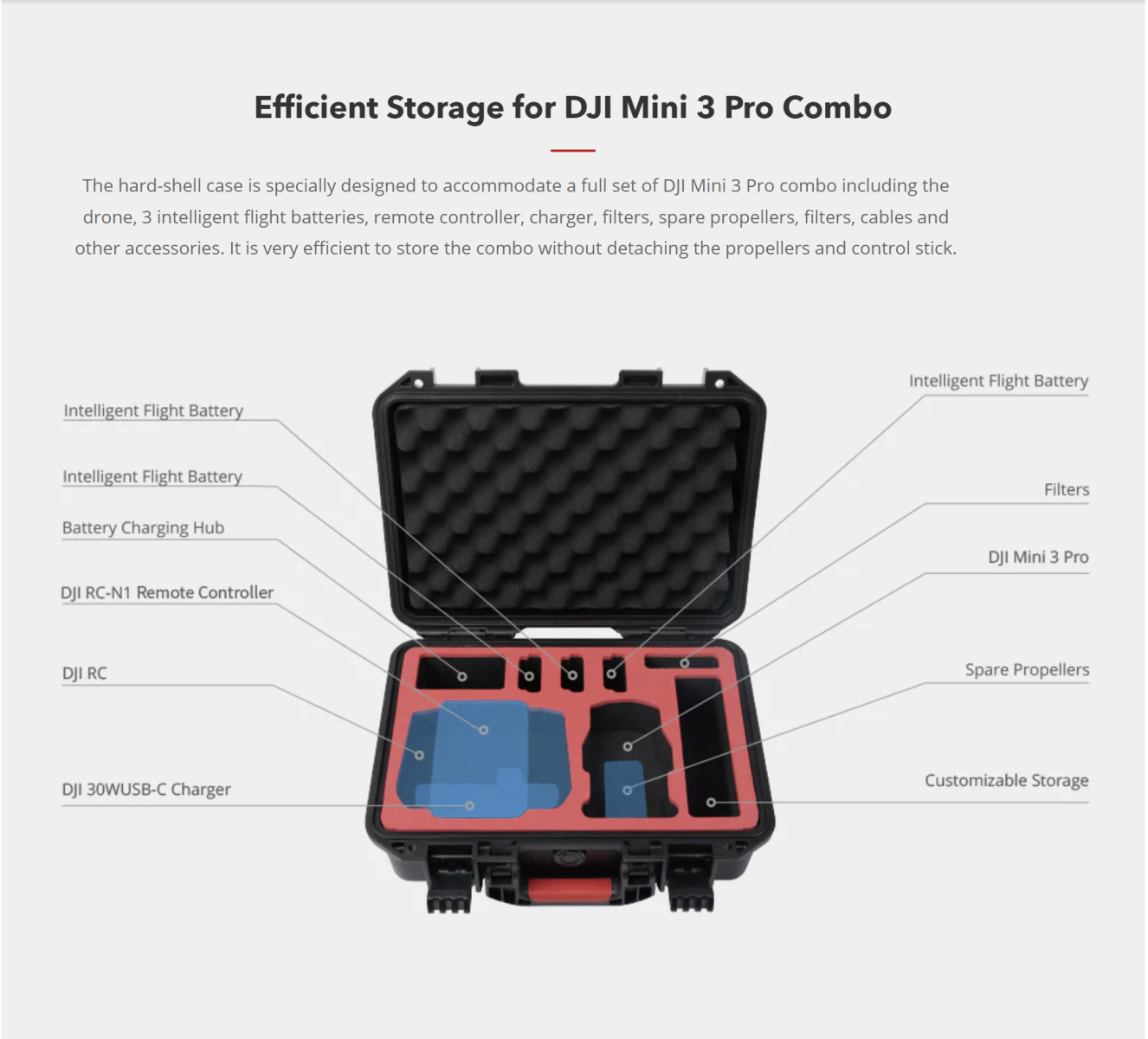 - Ample space to accomodate DJI Mini 3 Pro, remote controller, intelligent batteries, filters and cables;
