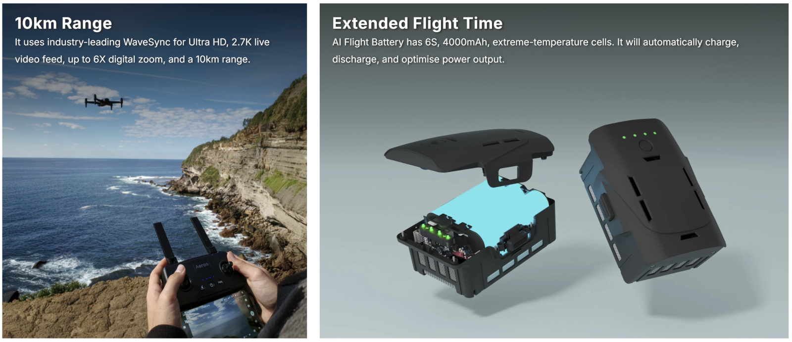 The Aeroo Pro's interchangeable AI Flight Battery has its own internal computer and can be used in extreme temperatures (-10°C to 40°C). It optimises power output for each scenario, to give you consistently long flight times up to 45 minutes per battery.