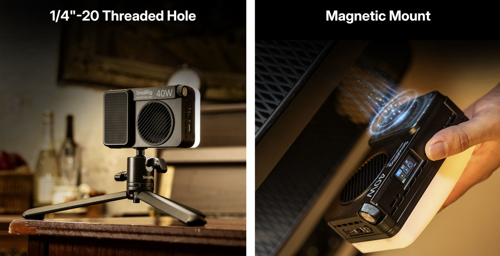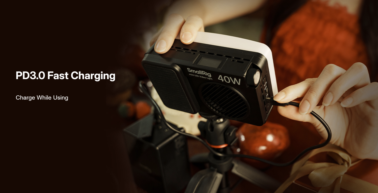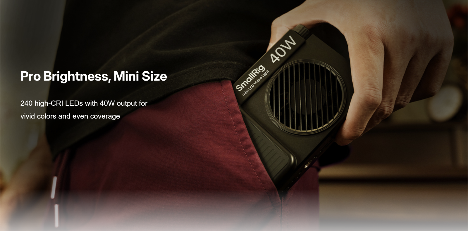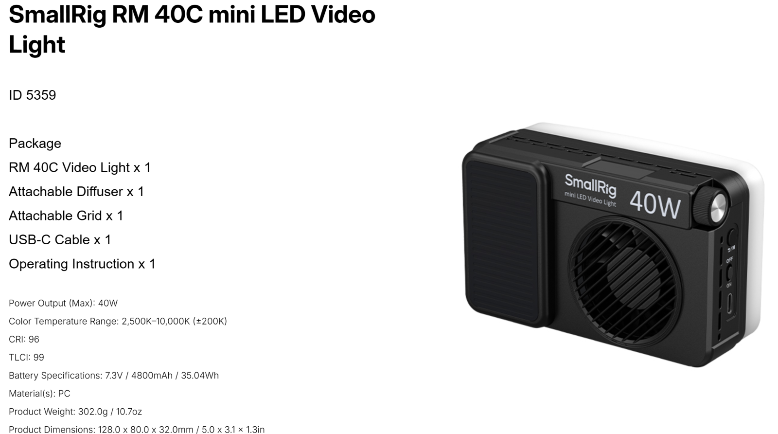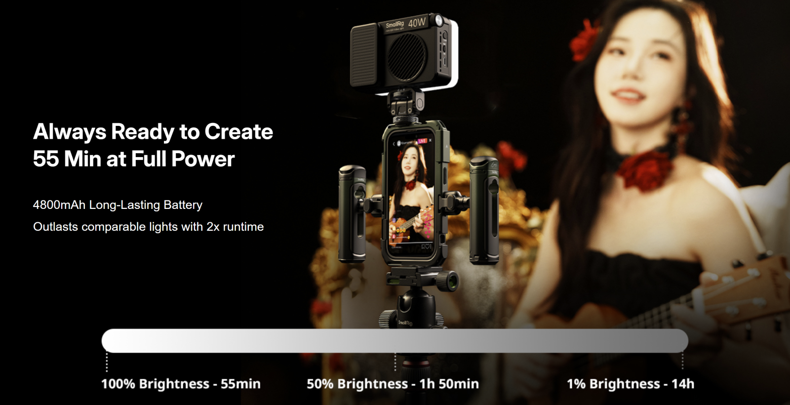 - Compact yet powerful: Delivering 40W output (4,670 lux @ 1m / 5600K daylight ), it's highly portable at just 128x80x32mm and 302g, with a built-in 4800mAh battery offering 55 minutes at full brightness.