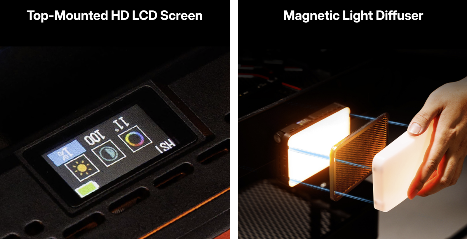- · User-friendly operation: Features a side HD LCD for clear settings viewing, magnetic snap-on/off diffuser and grid, and flexible magnetic mounting.