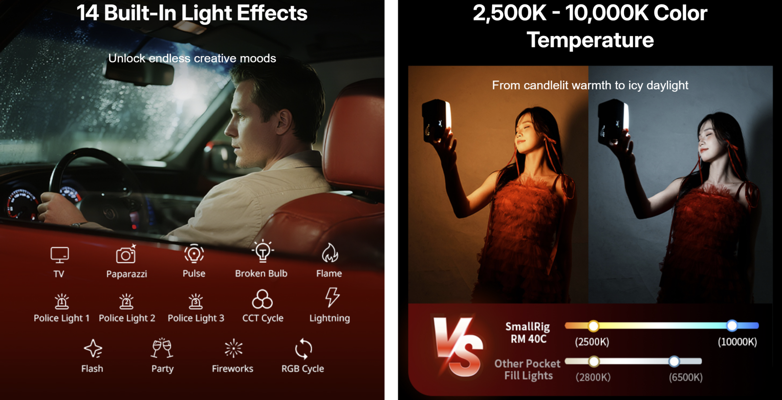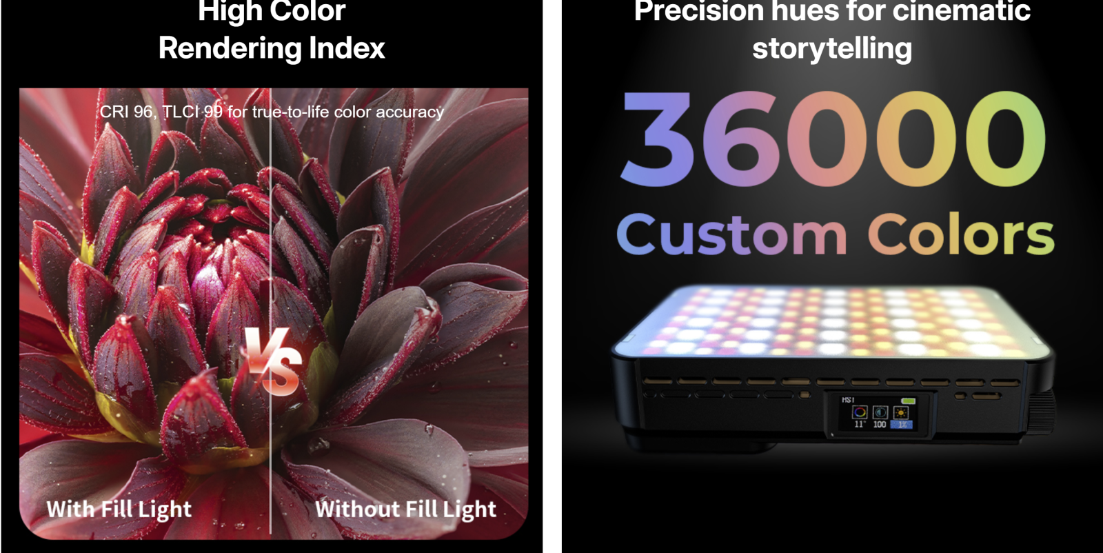 - Rich RGBWW lighting: Provides adjustable color temperature (2,500K–10,000K), 36,000+ high-fidelity colors, and 14 built-in environmental effects.