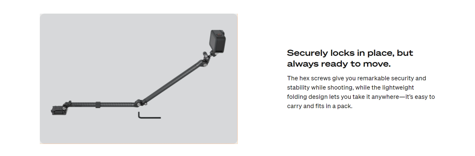 - Includes 2 carbon fiber arms, Ball-Joint Camera Mount, Curved + Flat Adhesive Mounts, mounting buckle, triangulation support slider, 4mm hex key, 2 extra hex screws and hex key storage clip