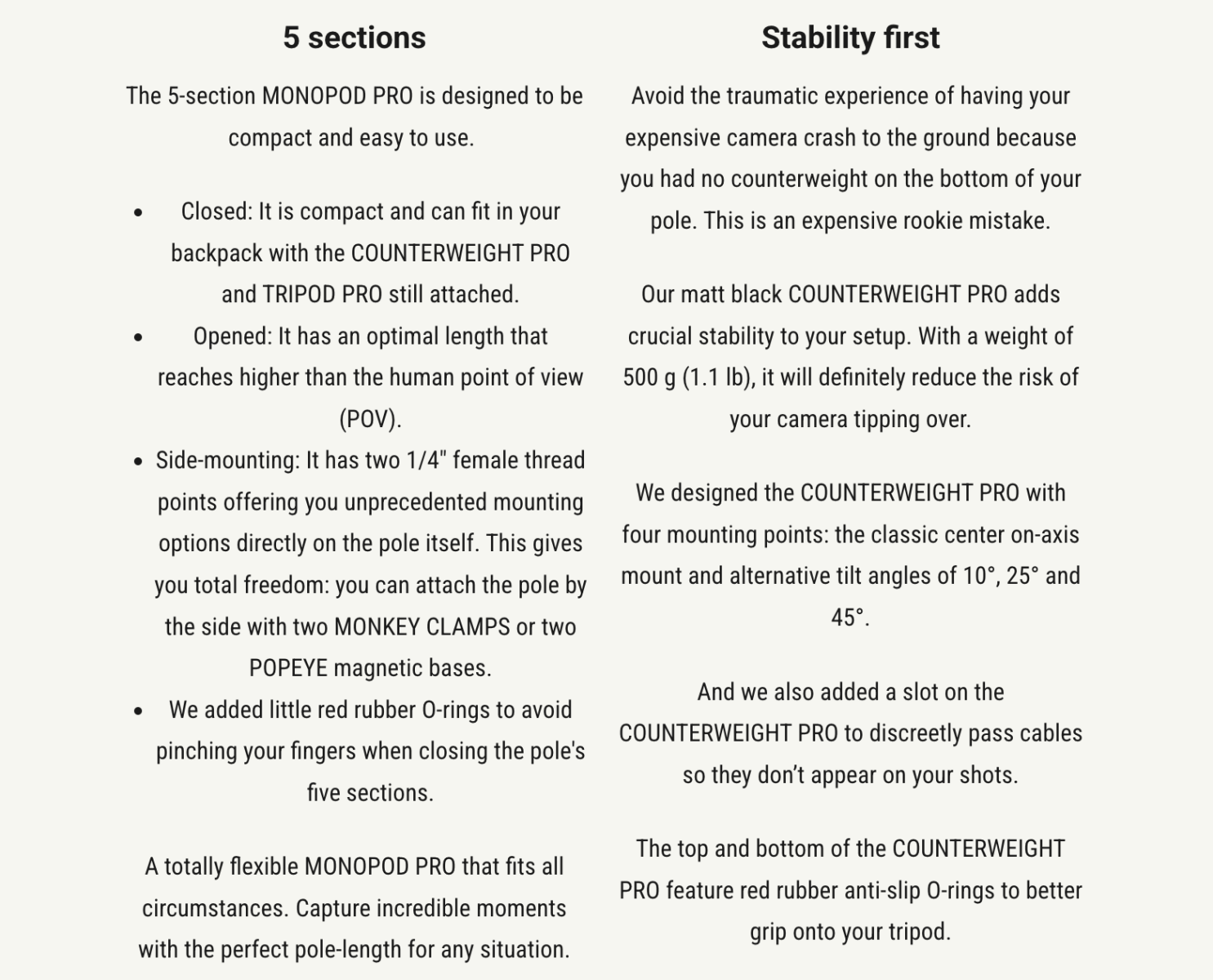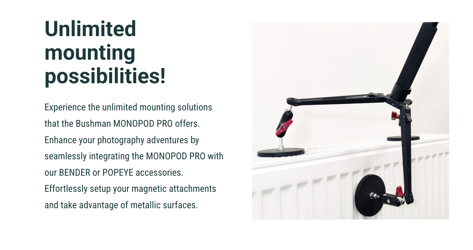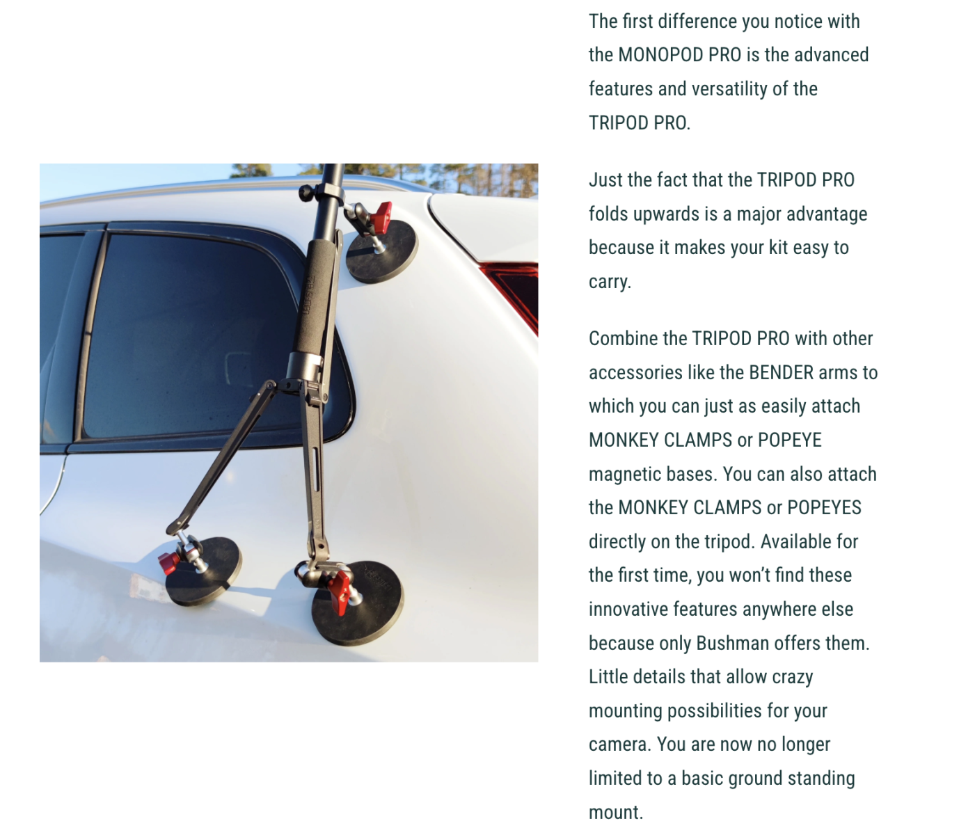 We put together a bundle that offers a complete solution for your professional 360° shoots. The bundle includes the famous Bushman MONOPOD PRO and all the accessories that go with it. Really, all the accessories that go with it!