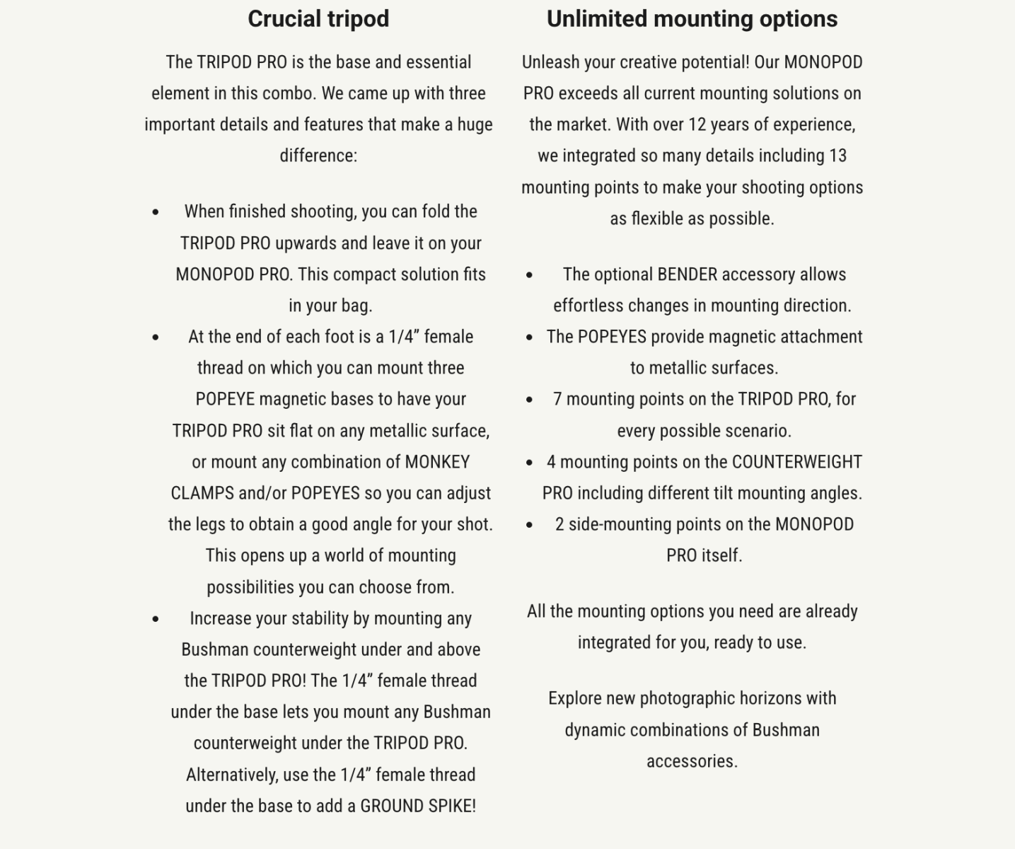 - on the bottom of the base: 1/4” female thread for mounting any Bushman counterweight under the base to lower the center of gravity
