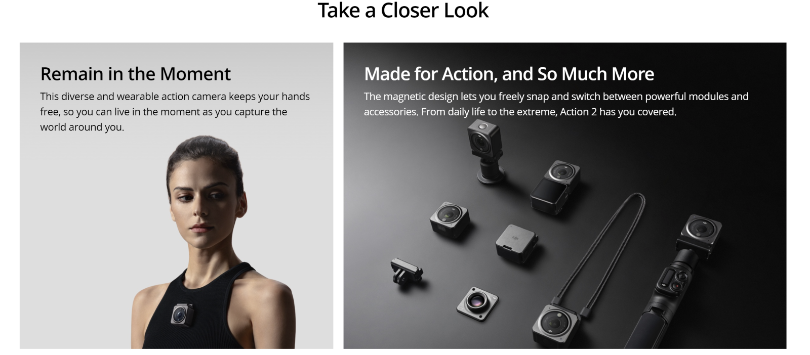 Action 2's magnetic design lets users freely snap and switch between powerful modules and accessories. This fluidity of form makes it the ultimate multi-functional action camera.