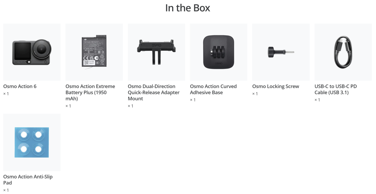 Includes the camera, Extreme Battery Plus (1950 mAh), Dual-Direction Quick-Release Adapter Mount and USB-C to USB-C PD Cable (USB 3.1) - enabling you to capture every thrilling moment with ease.