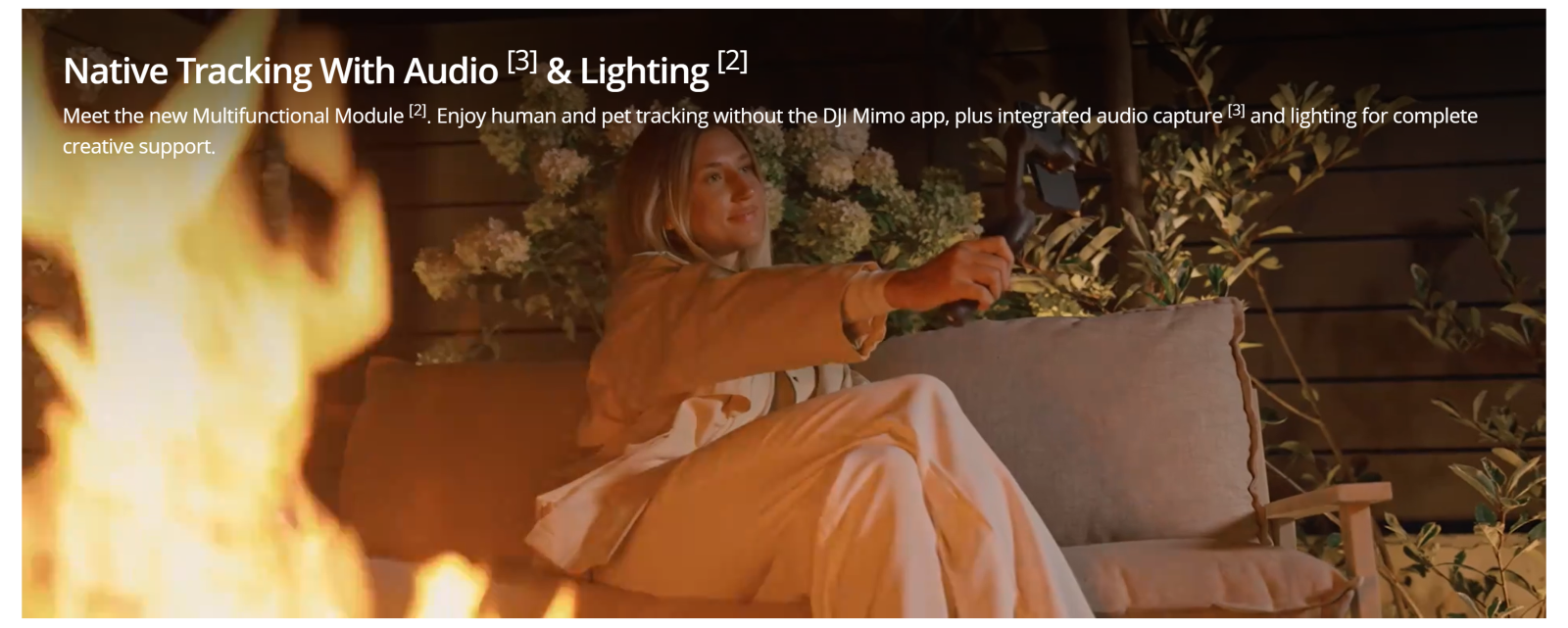 2. The DJI OM Multifunctional Module is required to enable tracking, audio reception (compatible with the DJI Mic 3/DJI Mic Mini/DJI Mic 2 Transmitter), and lighting features, and it only supports tracking human subjects or animals (cats and dogs).