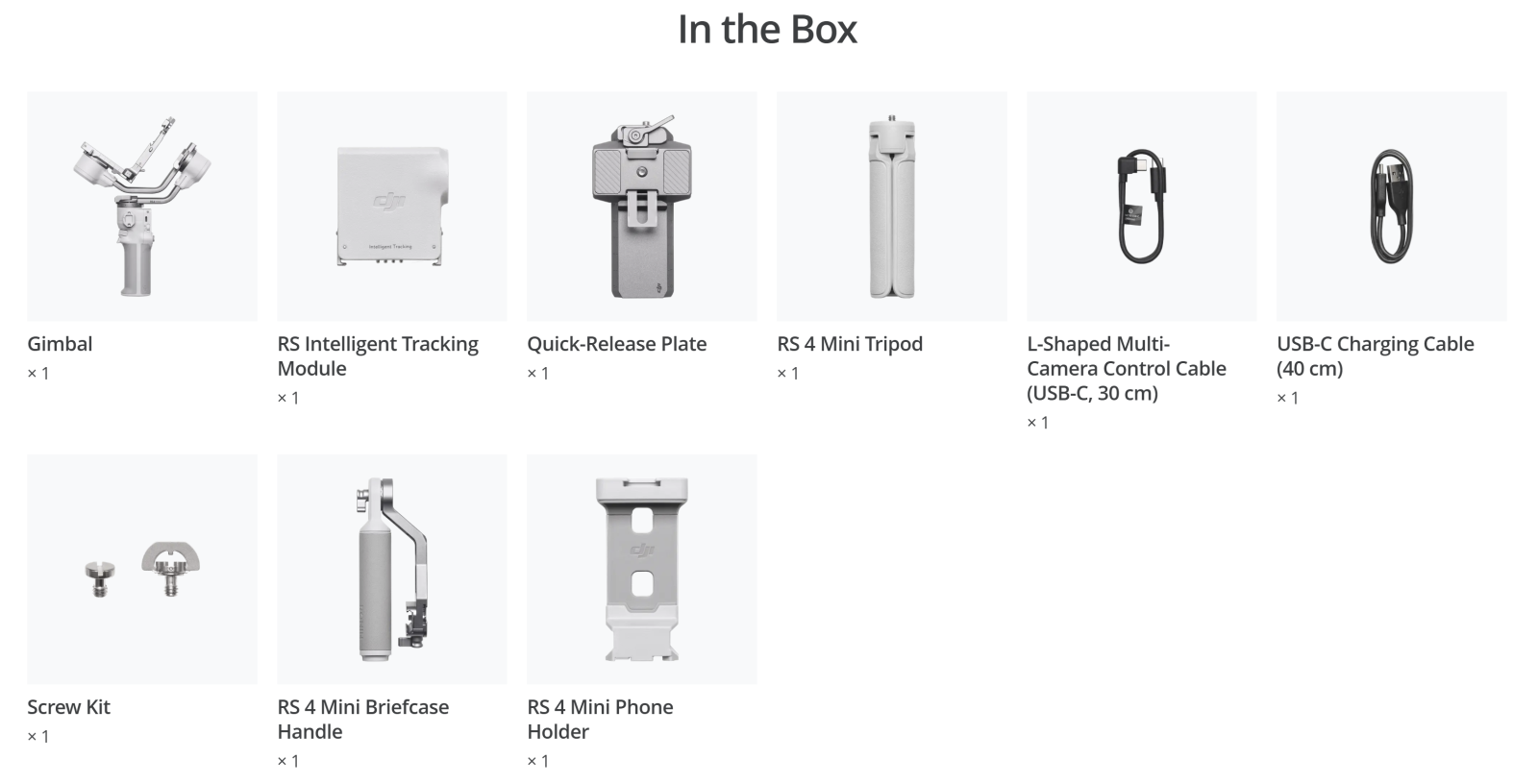 The RS 4 Mini Creator Combo also includes the Tracking Module, Mini Briefcase Handle and Phone Holder for intelligent tracking and effortless low-angle filming. The phone holder turns the gimbal into a smartphone stabiliser for more creative scenarios.