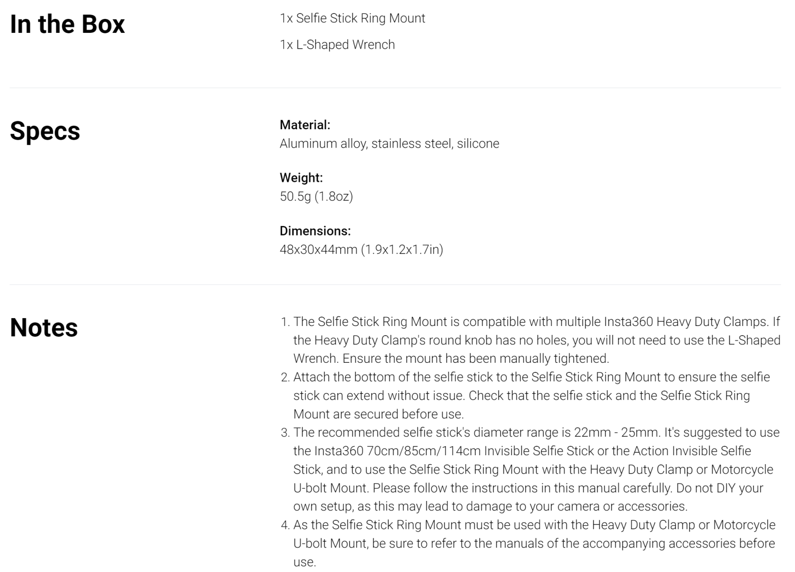 - Note: The Selfie Stick Ring Mount should be used with either the Heavy Duty Clamp or Motorcycle U-bolt Mount.