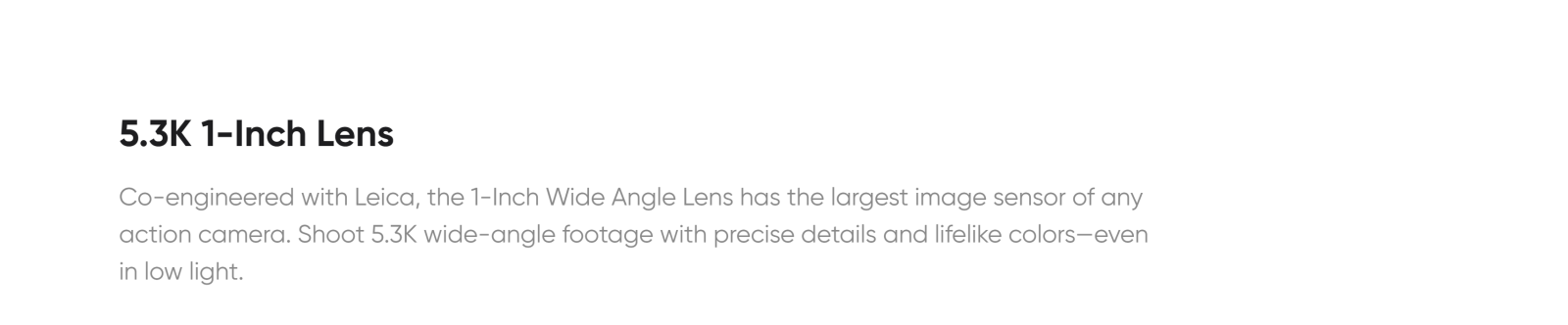 4K Boost Lens: This is an upgrade to the previous 4K Wide Angle Lens. Thanks to a larger 1/2" 48MP sensor, it shoots more detailed 4K 60fps video and 48MP photos. Two new innovative modes are also available: 6K Widescreen mode for ultra-high-res 2.35:1 videos and Active HDR mode for better highlights and shadows in action videos.
