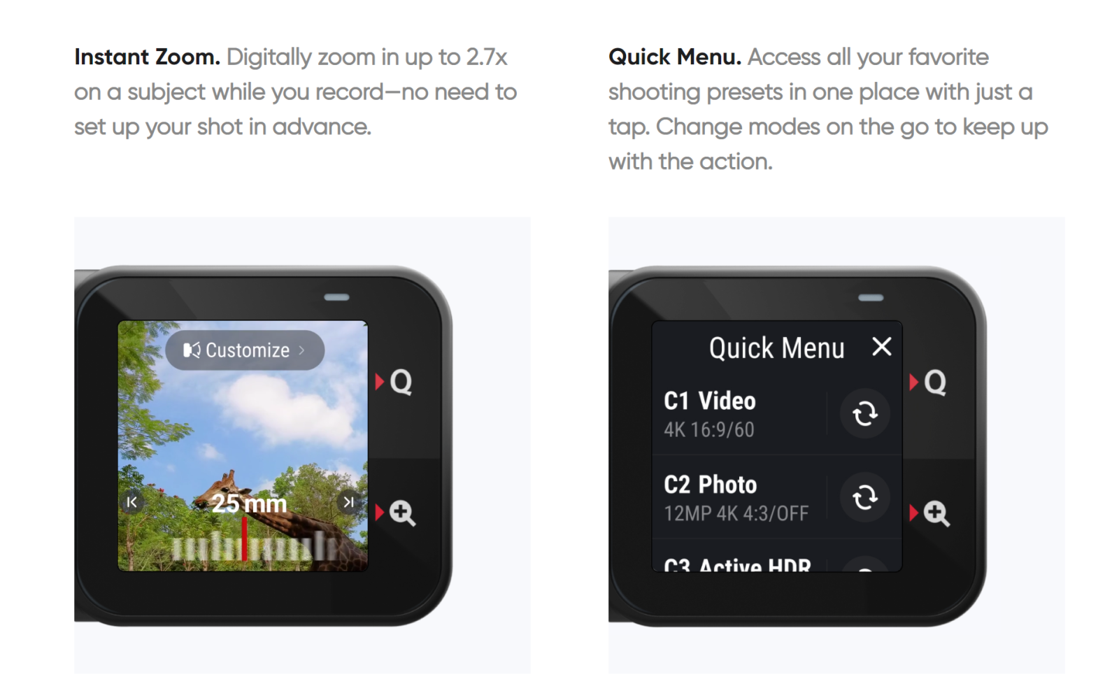 ONE RS Core: The all-new ONE RS Core boasts a new processor for improved in-camera FlowState stabilization and up to 50% faster WiFi transfers, as well as an additional mic for improved audio. Instant Zoom and the Quick menu are also available with the RS Core.