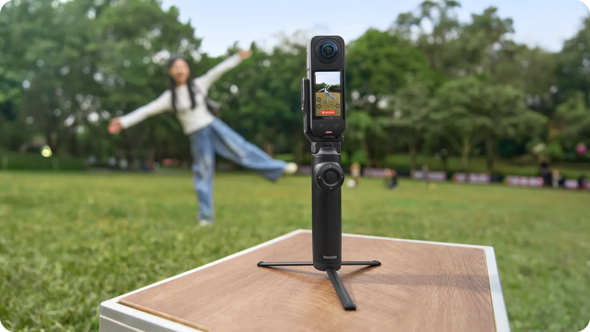Stable built-in tripod that unfolds in seconds. Set it up, step back, and get third-person shots, even when you're shooting solo.