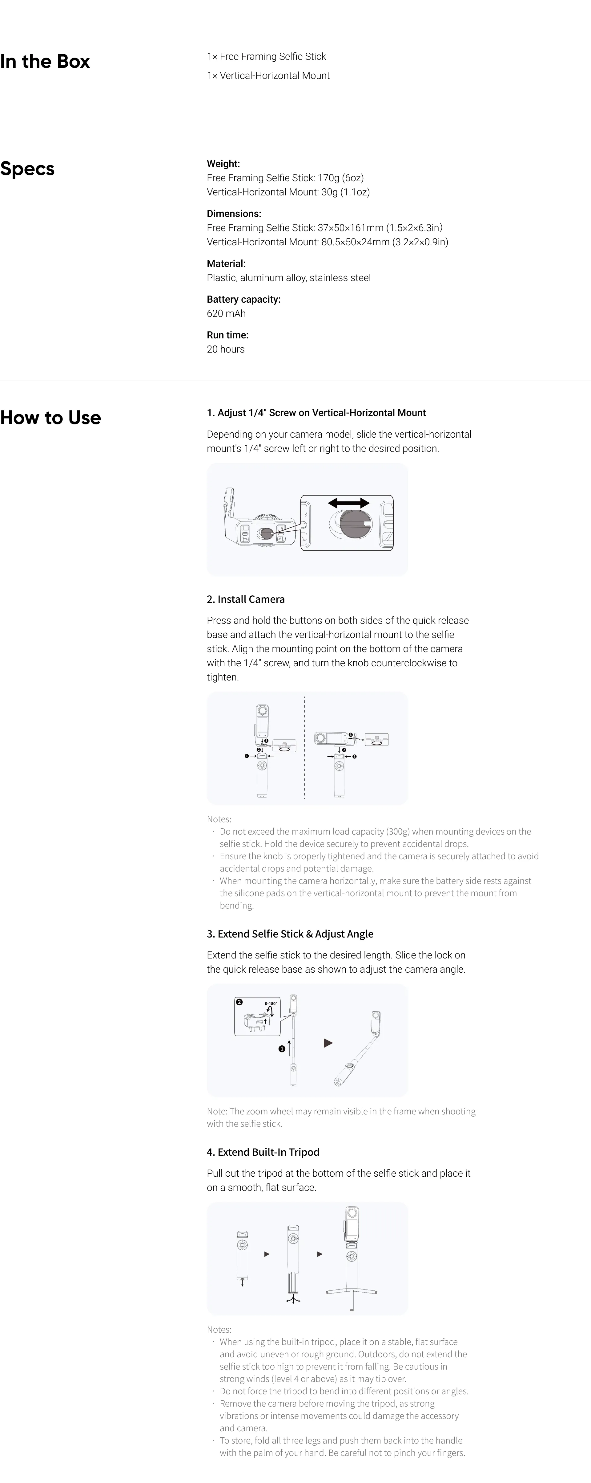 9. The vertical-horizontal mount and selfie stick contain magnets. Keep them away from pacemakers and other devices to avoid interference.