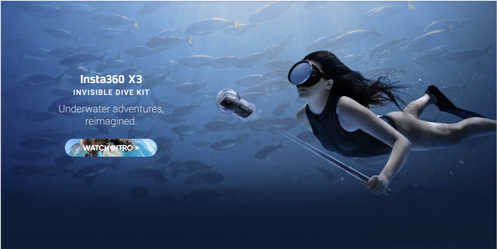 - Invisible Dive Kit includes 1x Insta360 X3, 1x Invisible Dive Case, 1x 64GB MicroSD Card, 1x Floating Hand Grip, 1x 114cm Invisible Selfie Stick and 1x Lens Cap.