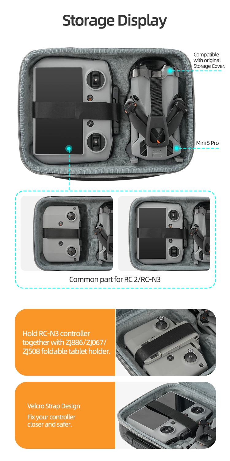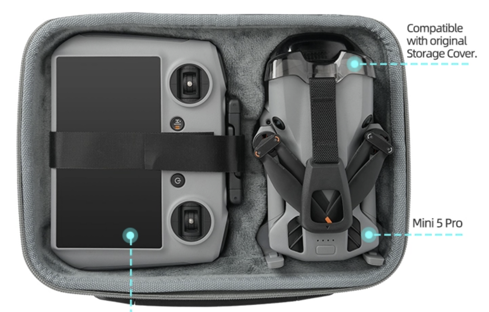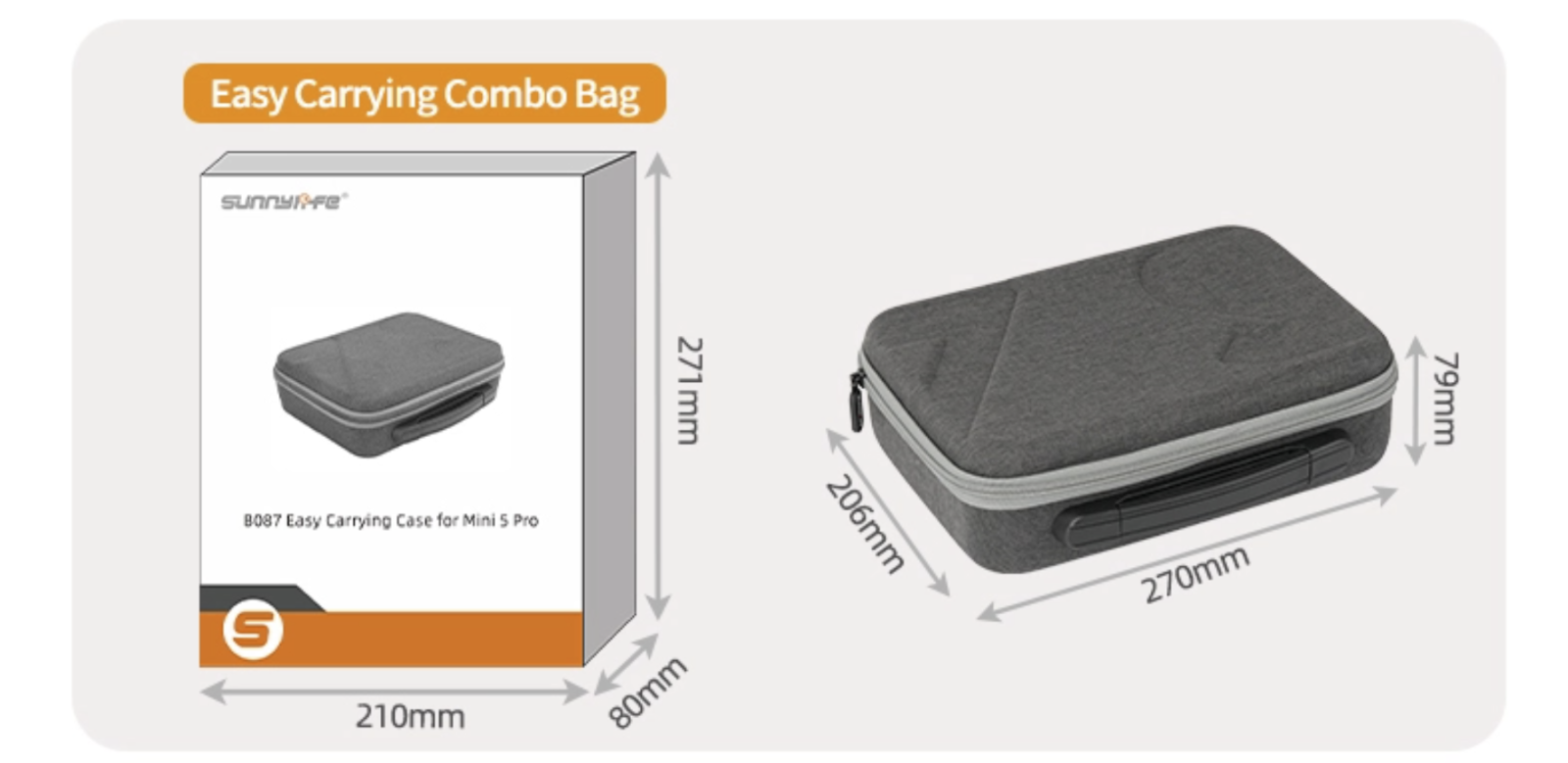 Part of Sunnylife's Mini 5 Pro Carrying Case Series, this is the Easy Combo Carrying Case. It holds the Mini 5 Pro and either the DJI RC 2 or RC-N3 remote control.