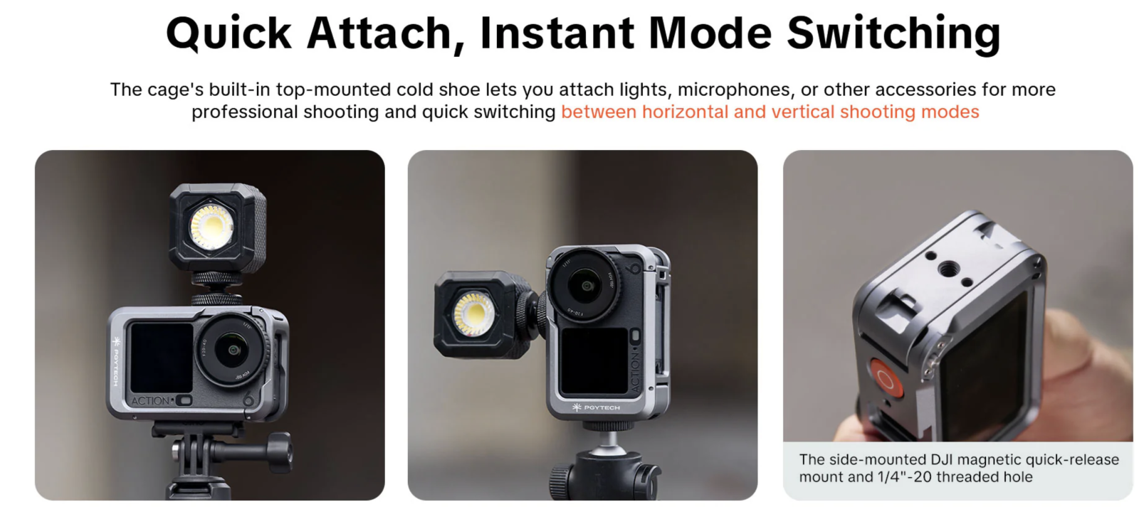 3. The built-in cold shoe, 1/4"-20 threaded hole, and DJI quick mount provide flexible accessory expansion options.