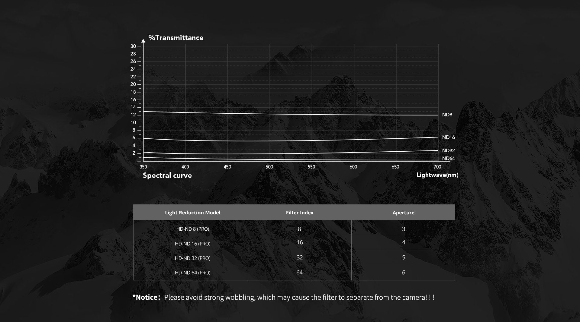The ND filter also called the Reducing Light filter, or Neutral Density filter reduces the amount of light in very bright conditions so that the camera can choose the correct exposure value and avoid excessive exposure.
