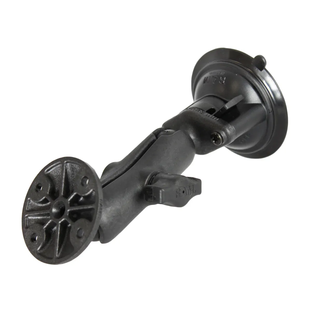 The RAP-B-166-202U consists of a double socket arm, 3.3" suction cup twist lock base and round base adapter that contains the universal AMPs hole patter. The mount is designed with a RAM 1" diameter patented rubber ball and socket system that has adjustment points at both ends of the double socket arm; this allowing for almost infinite adjustment and perfect viewing angles. The hole pattern found on the round base adapter will connect to many RAM cradles. The suction cup base is designed to have a strong hold on glass and non-porous plastic surfaces, including RAM adhesive disks.