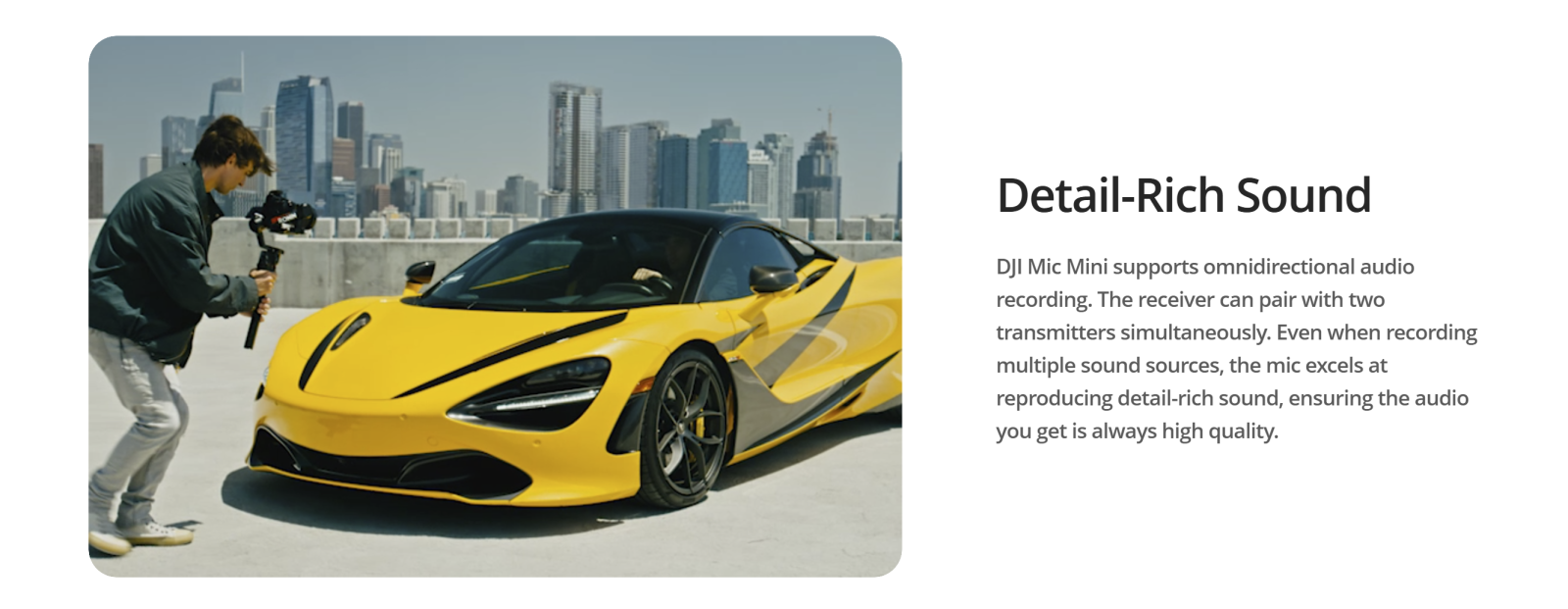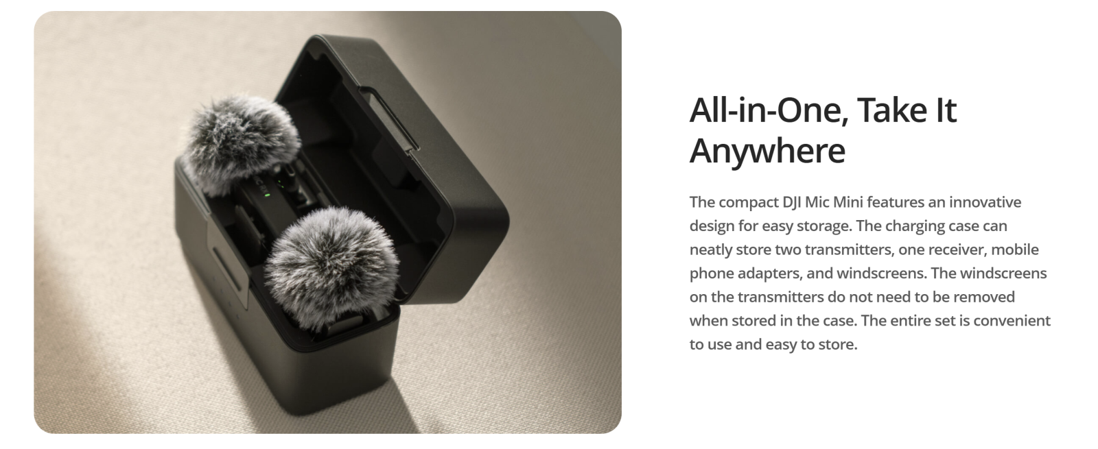 Introducing DJI Mic Mini, a wireless microphone that packs powerful performance into an ultralight body. It ensures stable transmission of high-quality audio, boasts extended battery life, and features direct connection with products in the DJI OsmoAudio™ ecosystem. Experience detail-rich sound recording that elevates your content creation experience. With a simple flip of the case, you are ready to add high-quality audio to any project.