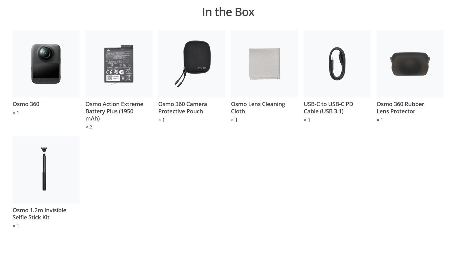 Includes the camera, a Protective Pouch, a Rubber Lens Protector, Osmo Action Extreme Battery Plus and 1.2m Selfie Stick. The camera features 105GB of built-in storage (microSD card not included)