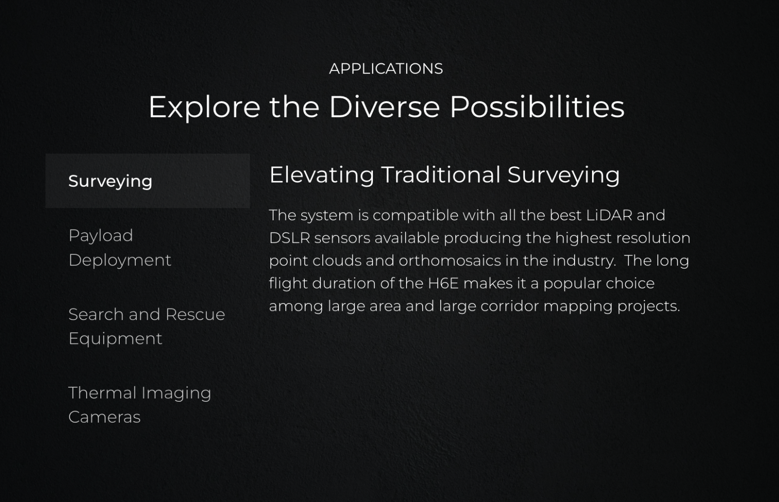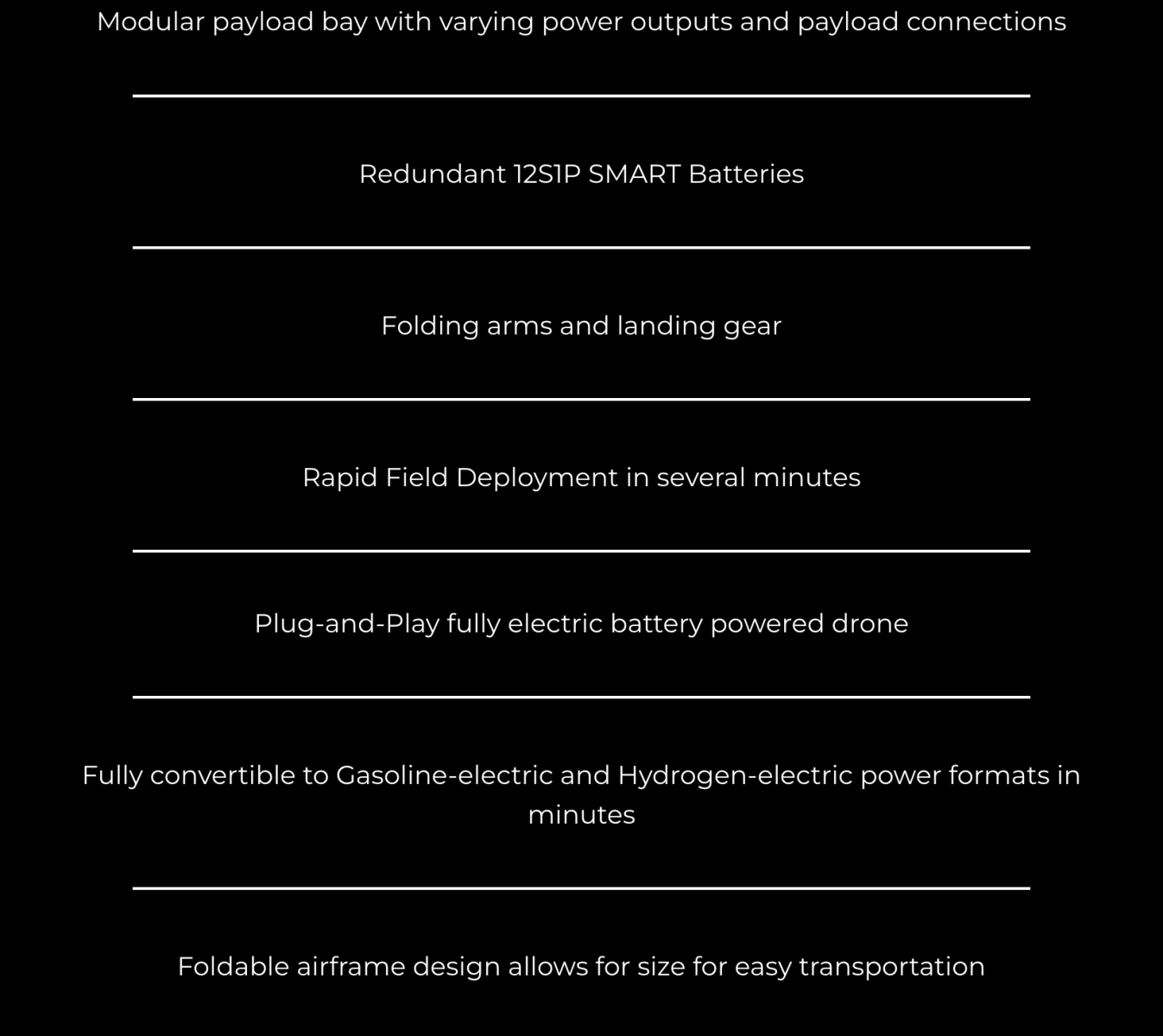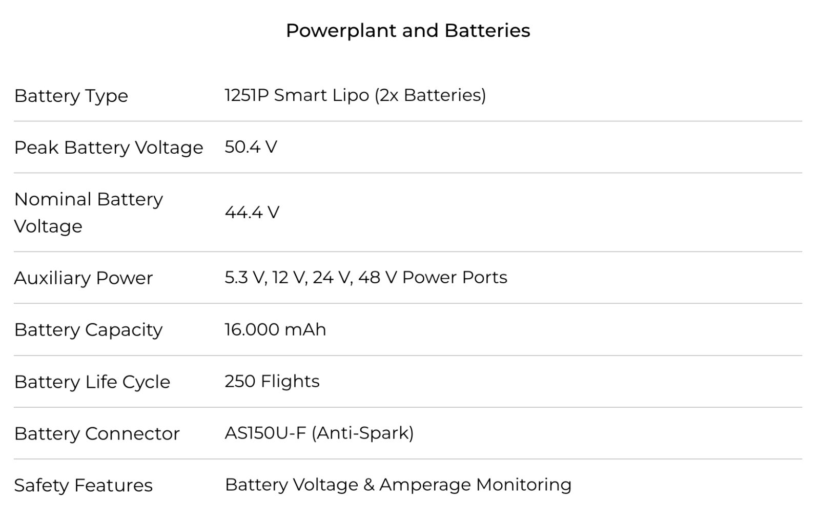 The H6 electric is equipped with Harris Aerial’s patent-pending battery rack system containing two smart 12S1P 16,000 mAh Lithium Polymer batteries providing flight times up to 48 minutes.
