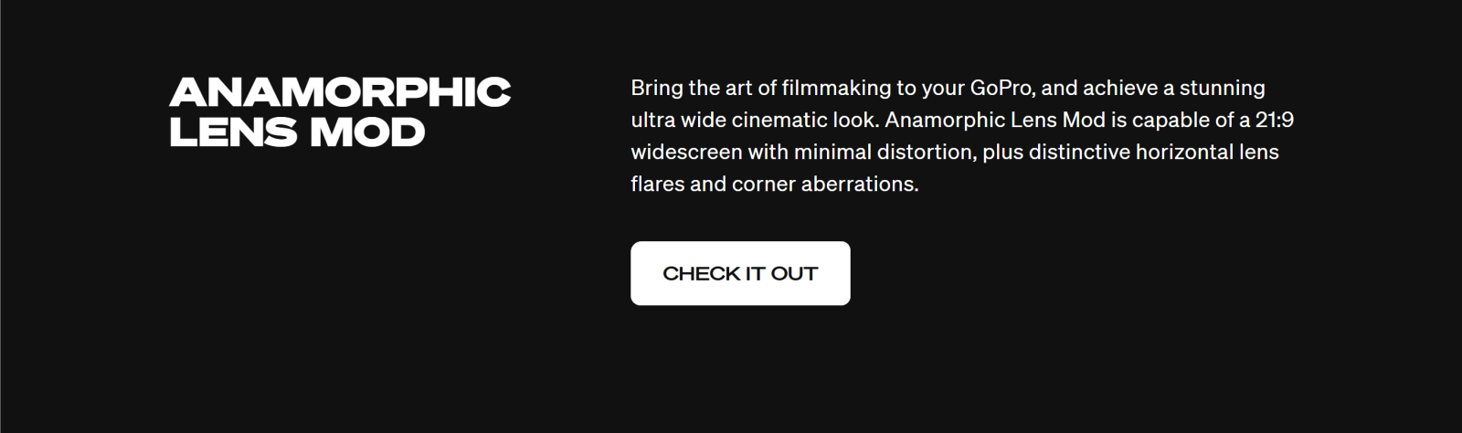 - Anamorphic Lens Mod captures cinematic footage in an ultra wide-angle 21:9 aspect ratio—ideal for static shots and stabilized gimbal footage of low impact/vibration activities²