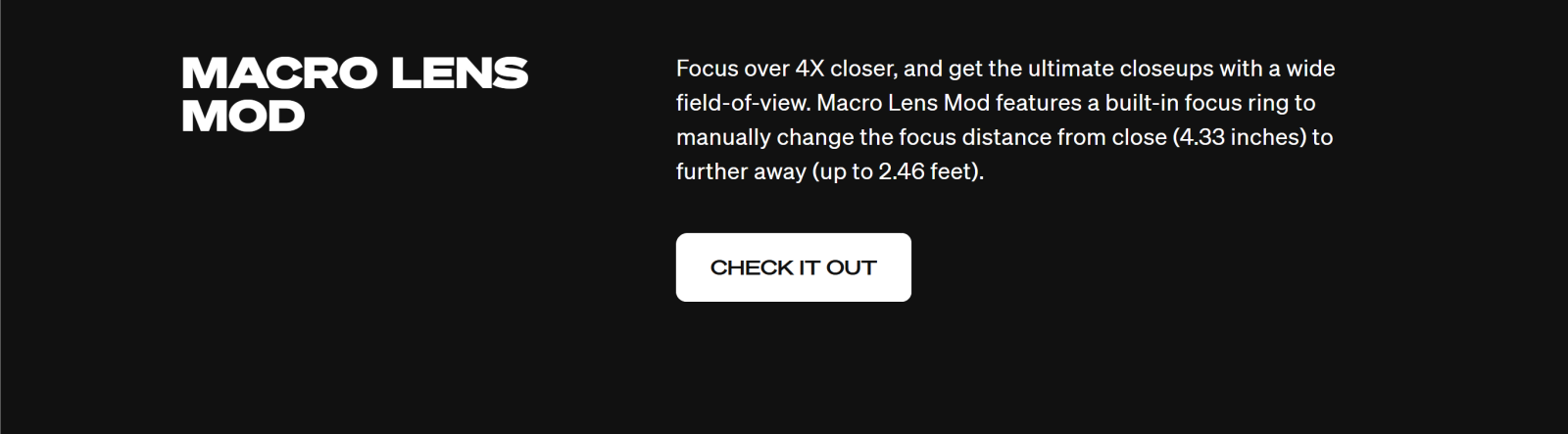 - Macro Lens Mod can focus on objects 4x closer than ever before for artistic slo-mos and time lapses