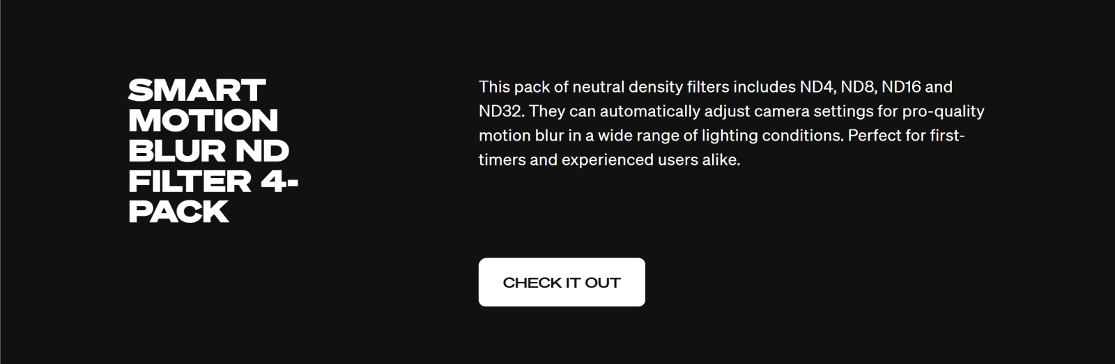 - Neutral Density Filters make it easy for first-time users to produce shots with motion blur, or experienced users can manually control exposure settings
