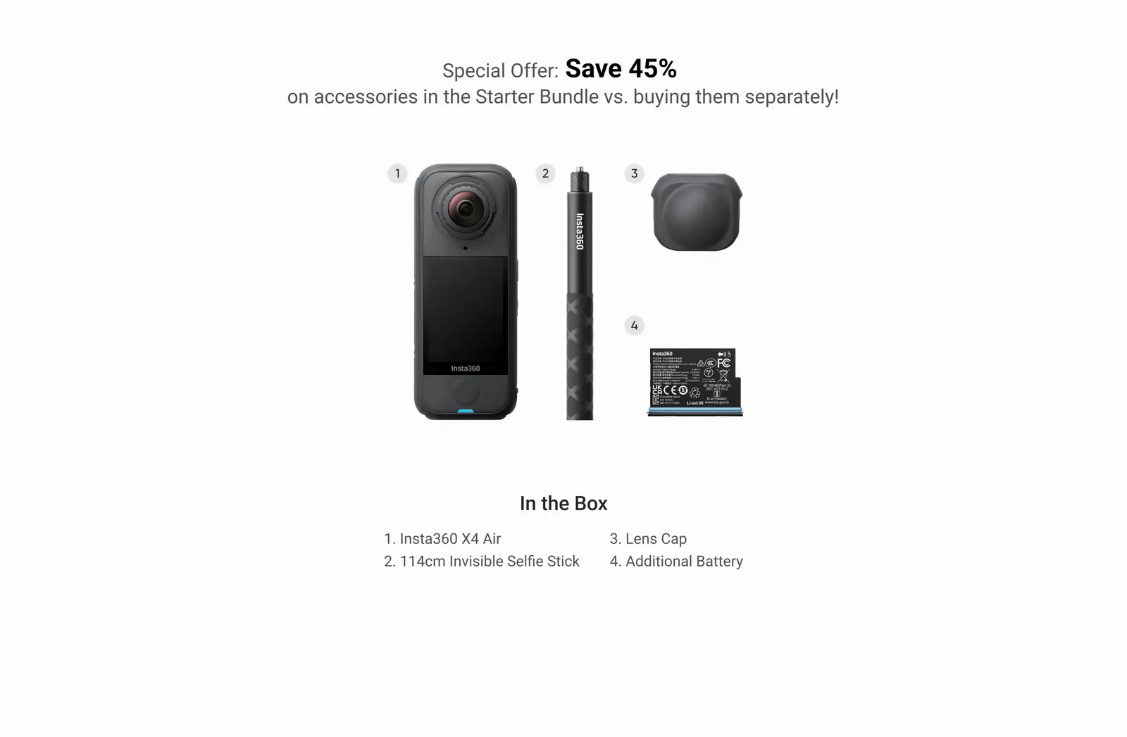Starter Bundle includes 1 x Insta360 X4 Air, 1 x Additional Battery, 1 x 114cm Invisible Selfie Stick and 1 x Lens Cap