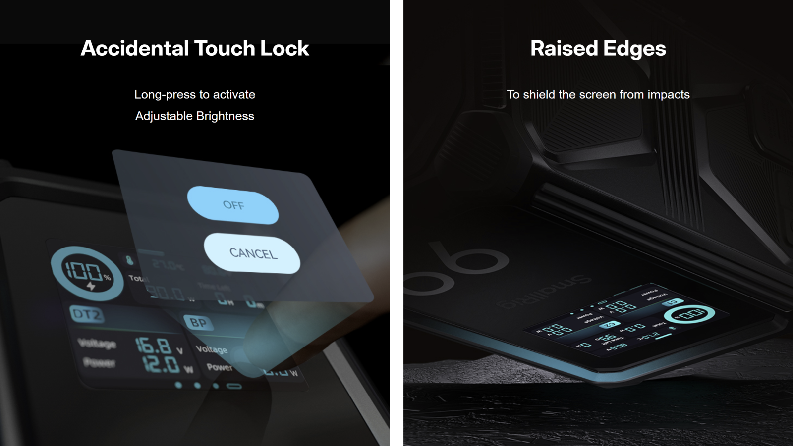 - Anti-Glare Touchscreen: 2” HD screen readable in sunlight, gorilla glass protection, 8s auto power-saving mode